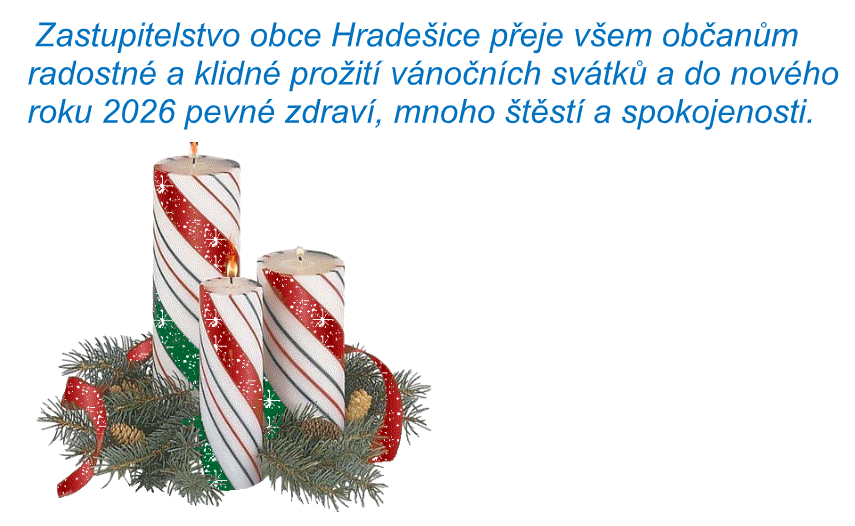 Zastupitelstvo obce Hradešice přeje všem občanům radostné a klidné prožití vánočních svátků a do nového roku 2021 pevné zdraví, mnoho štěstí a spokojenosti.